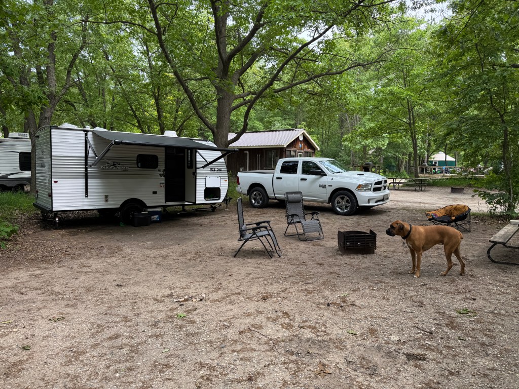 We stayed in the Riverside Campground 1 (as there are three main camping areas; Dunes, Burley and Riverside). We were on site 488 which when booking looked more like row/field camping. I was happy to see when we arrived that there were lots of trees between the sites, but had roads on both the front and back of the site. A benefit to this would be you didn’t have to back your trailer into the campsite. You could pull in whichever way you wanted or made sense.
