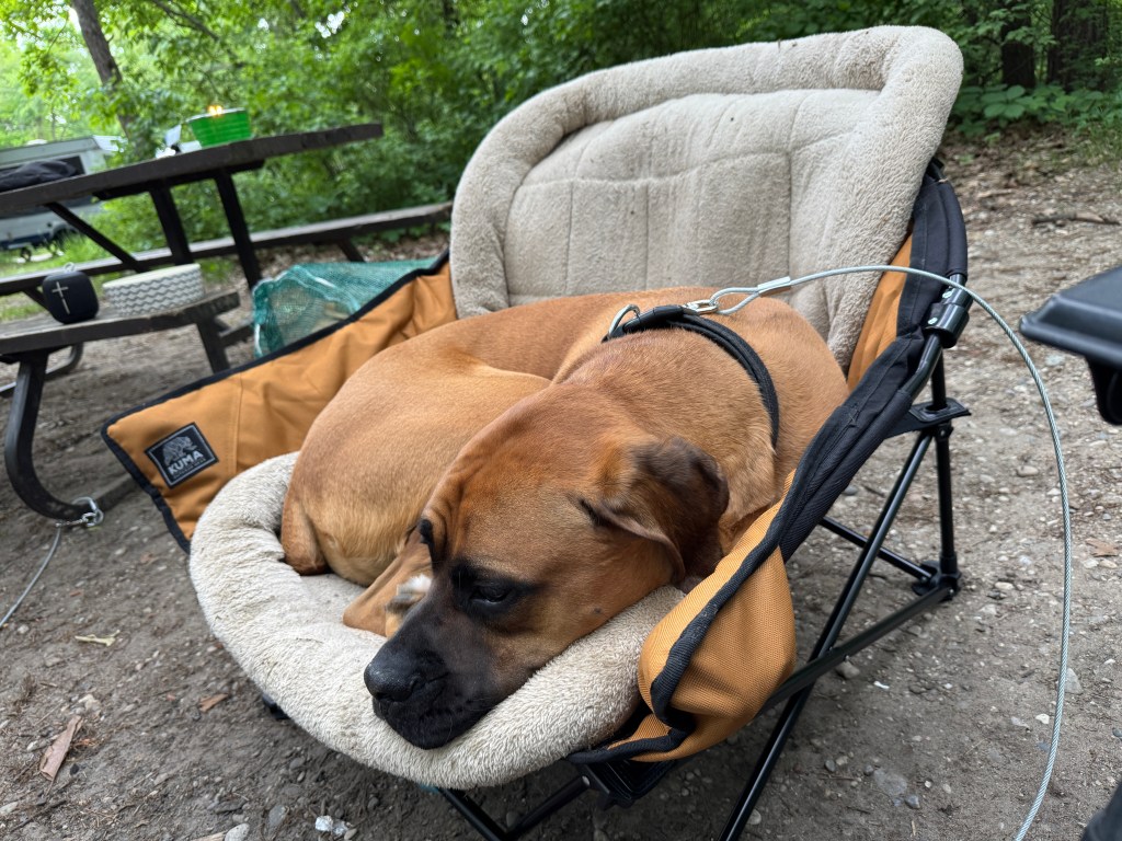 Angus is new to camping and he’s basically a diva, so he really wasn’t sure about it. He didn’t like his camping chair (Lazy Bear Folding Pet Chair) and preferred the dirt. Good news is – the cats at home love the chair, so it’s still basically a win. Since Angus didn’t like the chair, he was lying in the dirt and therefore we ended up buying some outdoor carpets and he was content to lay on those.