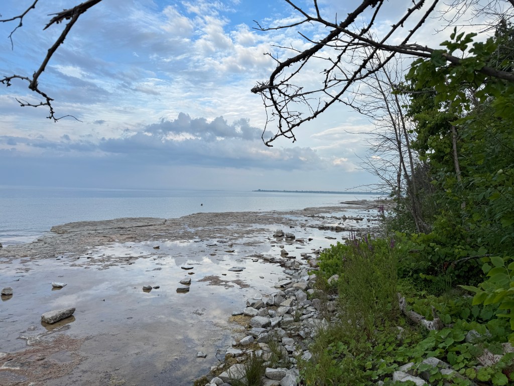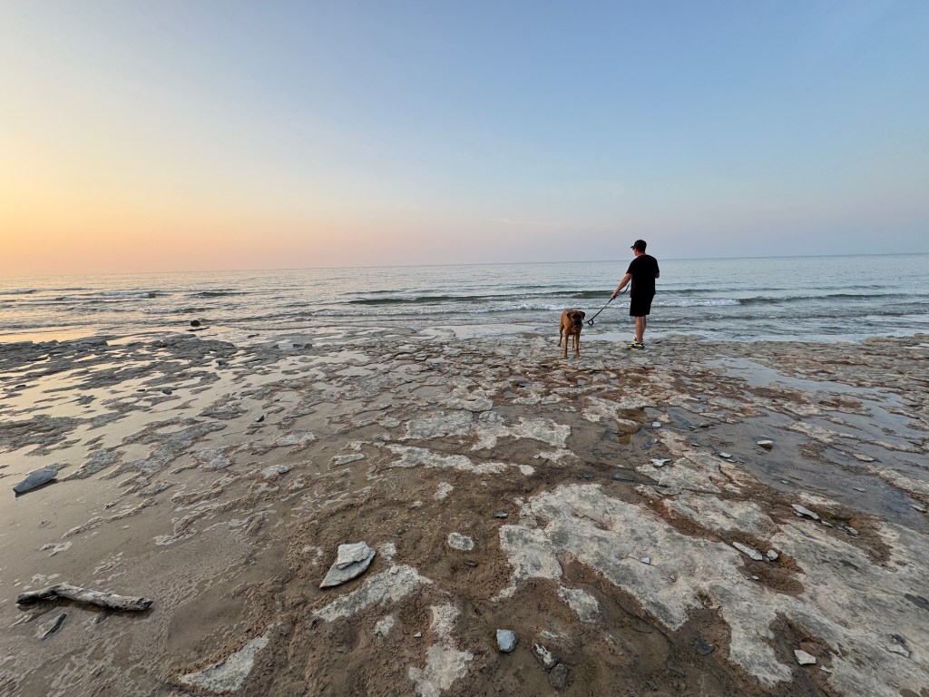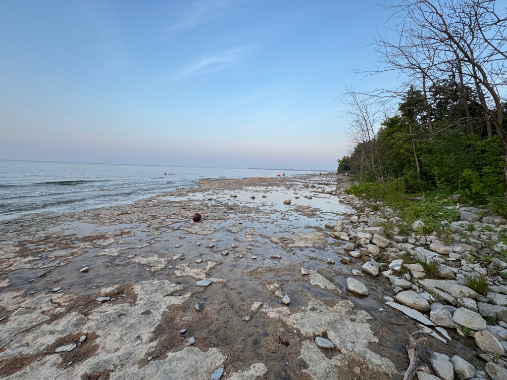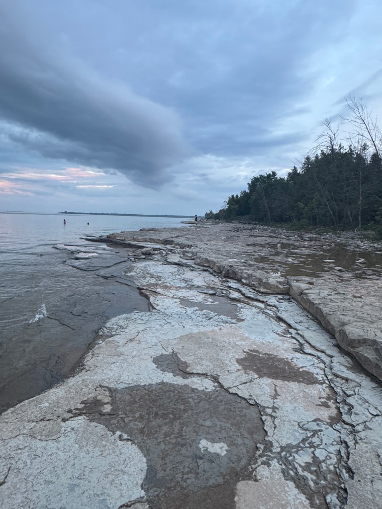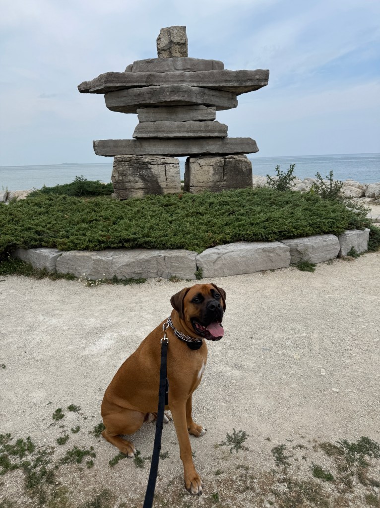 If you’re camping at Craigleith, be prepared to leave the campground to find some things to do. We spent Saturday driving through Meaford, Thornbury and Collingwood. There is a lovely dog “beach” (again, all rock) in Collingwood at Sunset Point Beach. This was a really nice area that had lots of walking paths, parks, food, and a really large Inukshuk.