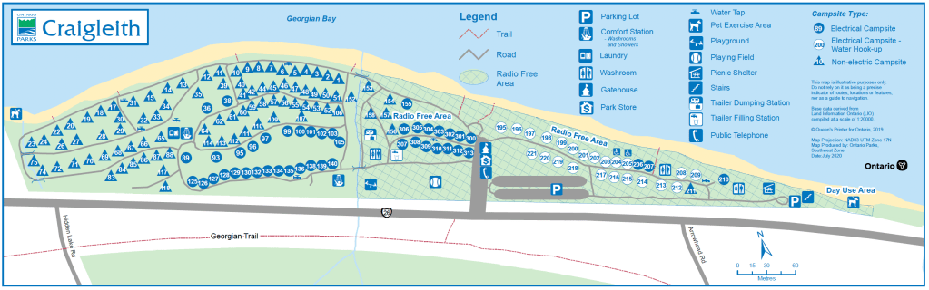 Craigleith is small, and has 157 campsites offering non-serviced sites as well as electric only, and some sites that have electric and water hook up. We were on an electric and water hook up site, that was also on the edge of Georgian Bay.