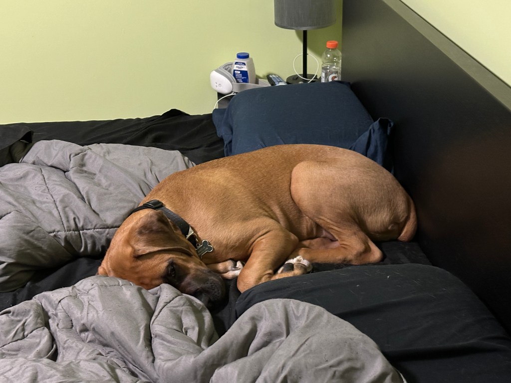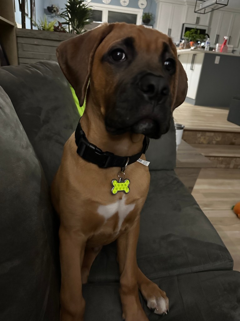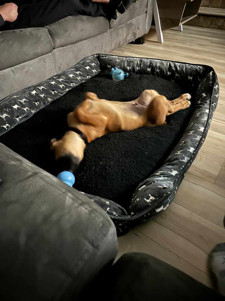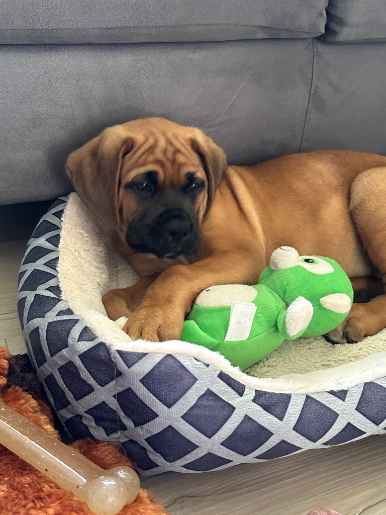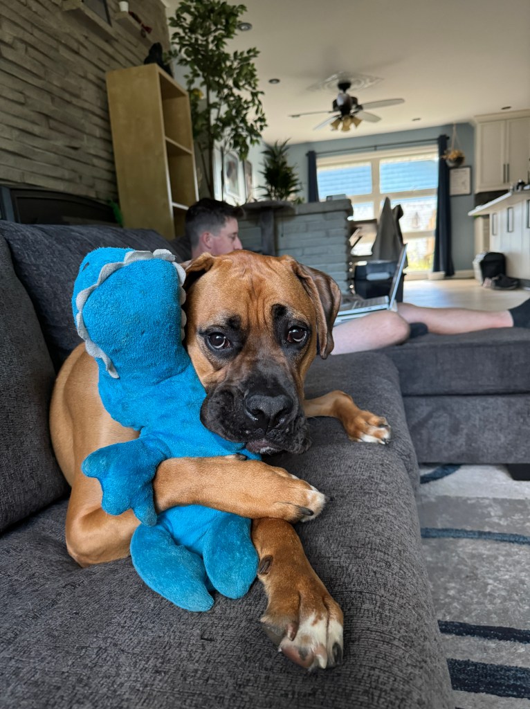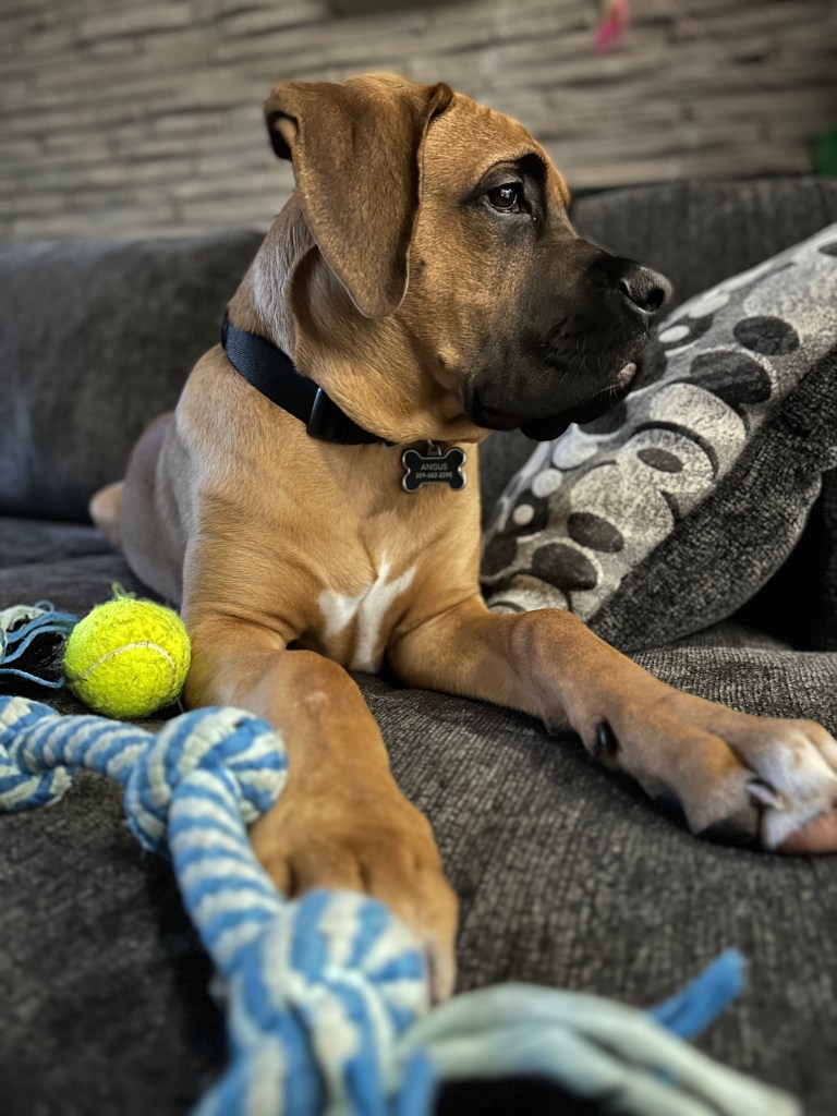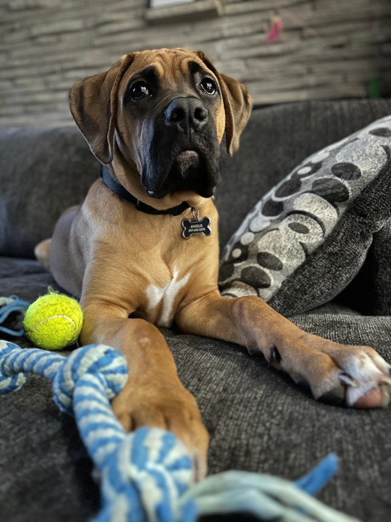 Angus is 2 years old! His birthday is July 21, 2023. He is LARGE. He’s basically another human sleeping in bed with us! Don’t worry, if you meet him – he’s loveable and friendly.