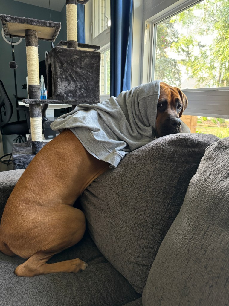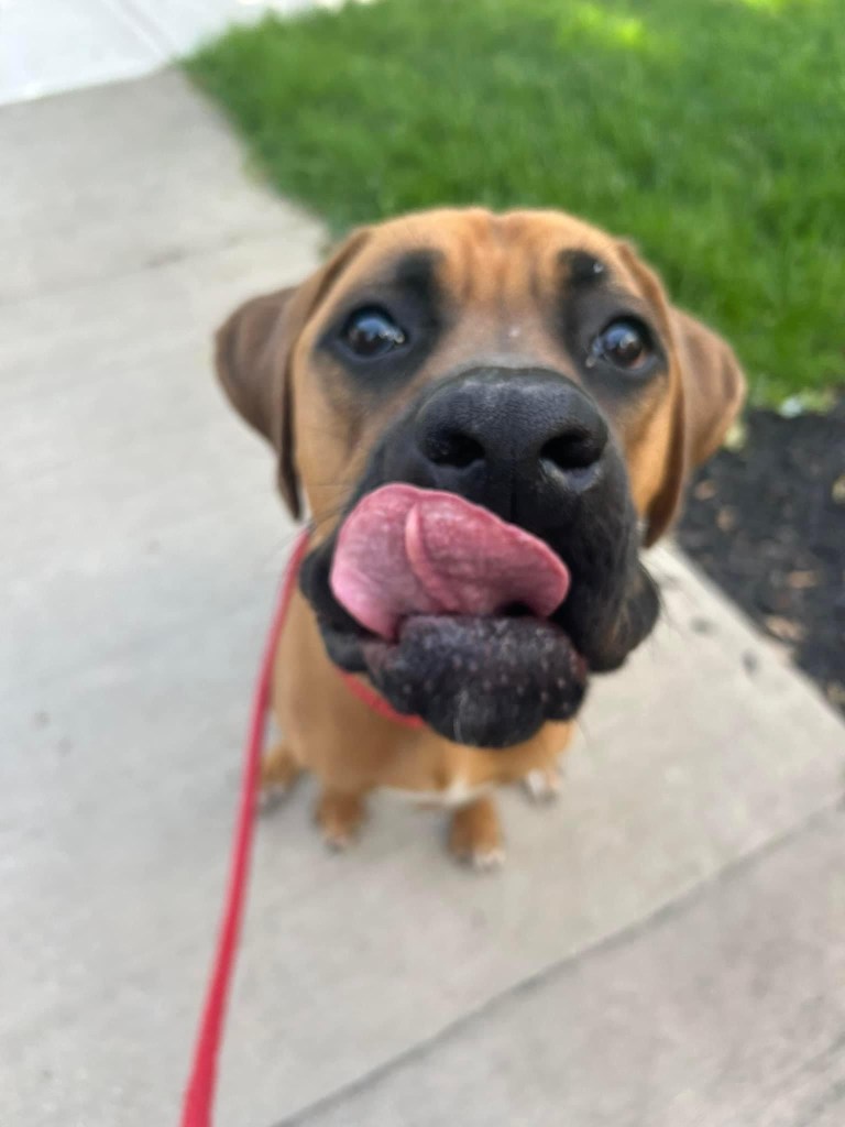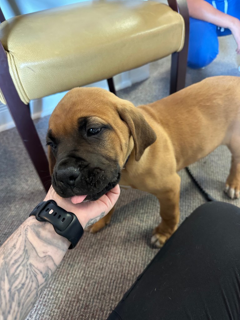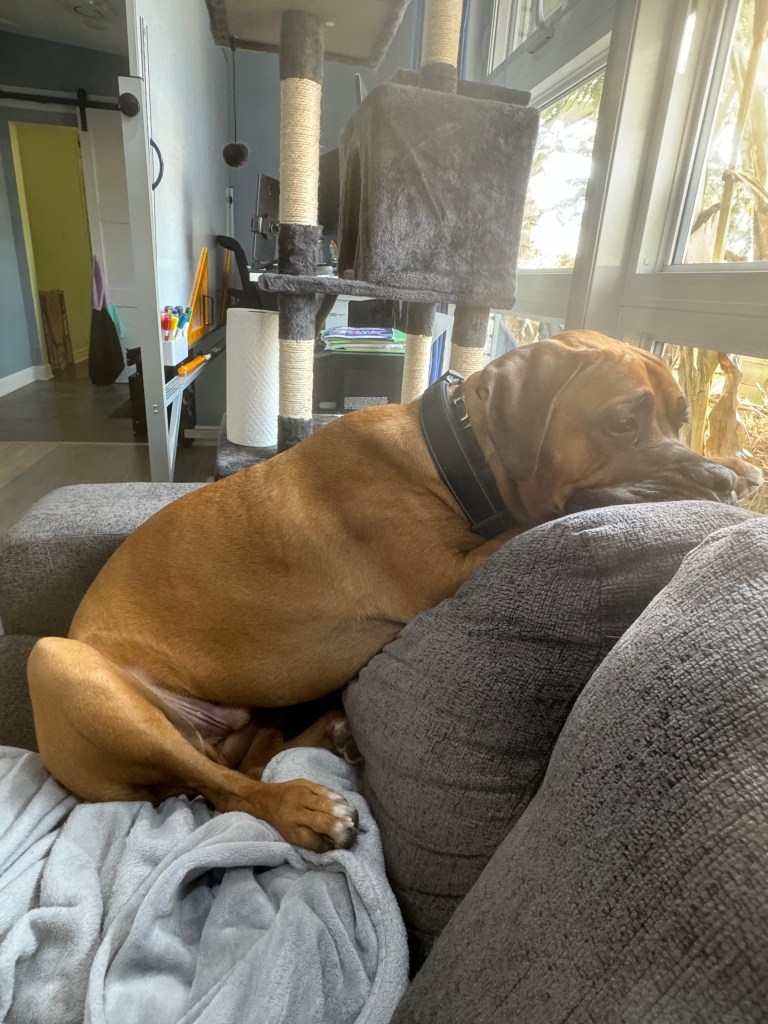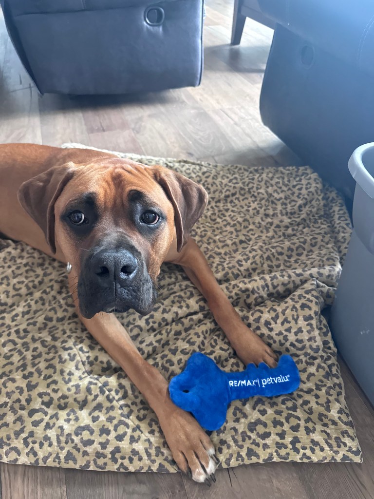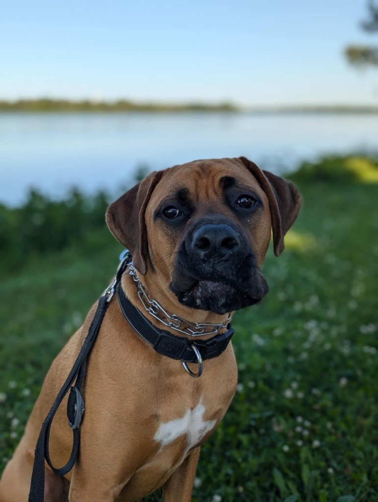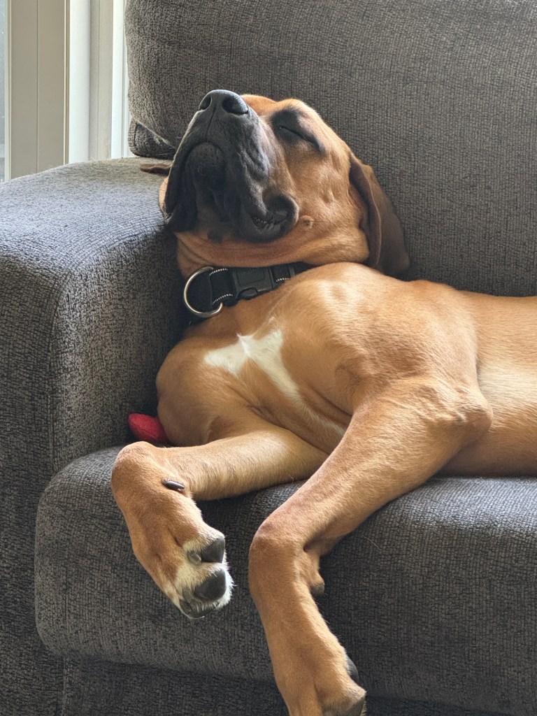 Angus is 2 years old! His birthday is July 21, 2023. He is LARGE. He’s basically another human sleeping in bed with us! Don’t worry, if you meet him – he’s loveable and friendly.