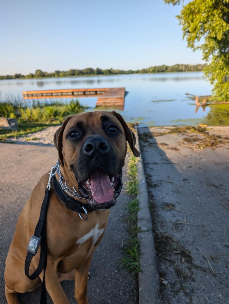 He is a giant softy, and is scared of a lot of things: Pergola screens, boxes, grocery bags, tupperware, etc. We aren’t totally sure why he’s so scared of these things, but work everyday to overcome these fears. Most recently, he didn’t like the rock piles in the lake at Craigleith Provincial Park, and wouldn’t come in the water until they were knocked over.